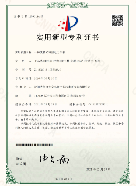 近日,沈陽達能電安全高新產業(yè)技術研究院(以下簡稱達能研究院)榮獲由國家知識產權局頒發(fā)的實用新型專利證書《一種便攜式測溫電力手套》及《一種輸變電設備多場耦合發(fā)生裝置》。達能研究院積極踐行知識產權戰(zhàn)略,聚焦行業(yè)前沿技術,深入開展產學研互動。《一種便攜式測溫電力手套》聚焦測溫領域,貼合市場需求,便攜易操作,耐久性強。《一種輸變電設備多場耦合發(fā)生裝置》聚焦輸變配電設備安全管理,以前沿技術為輸變電設備提供安全保障。
