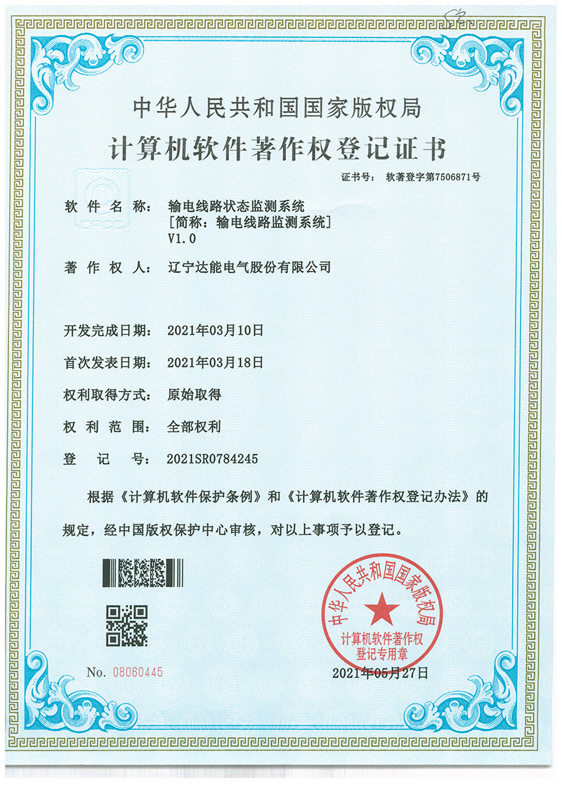 近日,達能電氣集團榮獲由國家版權(quán)局頒發(fā)的《輸電線路狀態(tài)監(jiān)測系統(tǒng)》軟件著作權(quán),這是公司不斷踐行科技發(fā)展戰(zhàn)略及知識產(chǎn)權(quán)戰(zhàn)略的有力成果?!遁旊娋€路狀態(tài)監(jiān)測系統(tǒng)》(簡稱輸電線路監(jiān)測系統(tǒng)V1.0)是公司科研團隊圍繞公司核心業(yè)務(wù)研發(fā)升級的最新系統(tǒng),緊跟行業(yè)前沿科技,提升在線監(jiān)測水平,推進輸電新路安全升級,助力公司不斷建立核心產(chǎn)品優(yōu)勢。