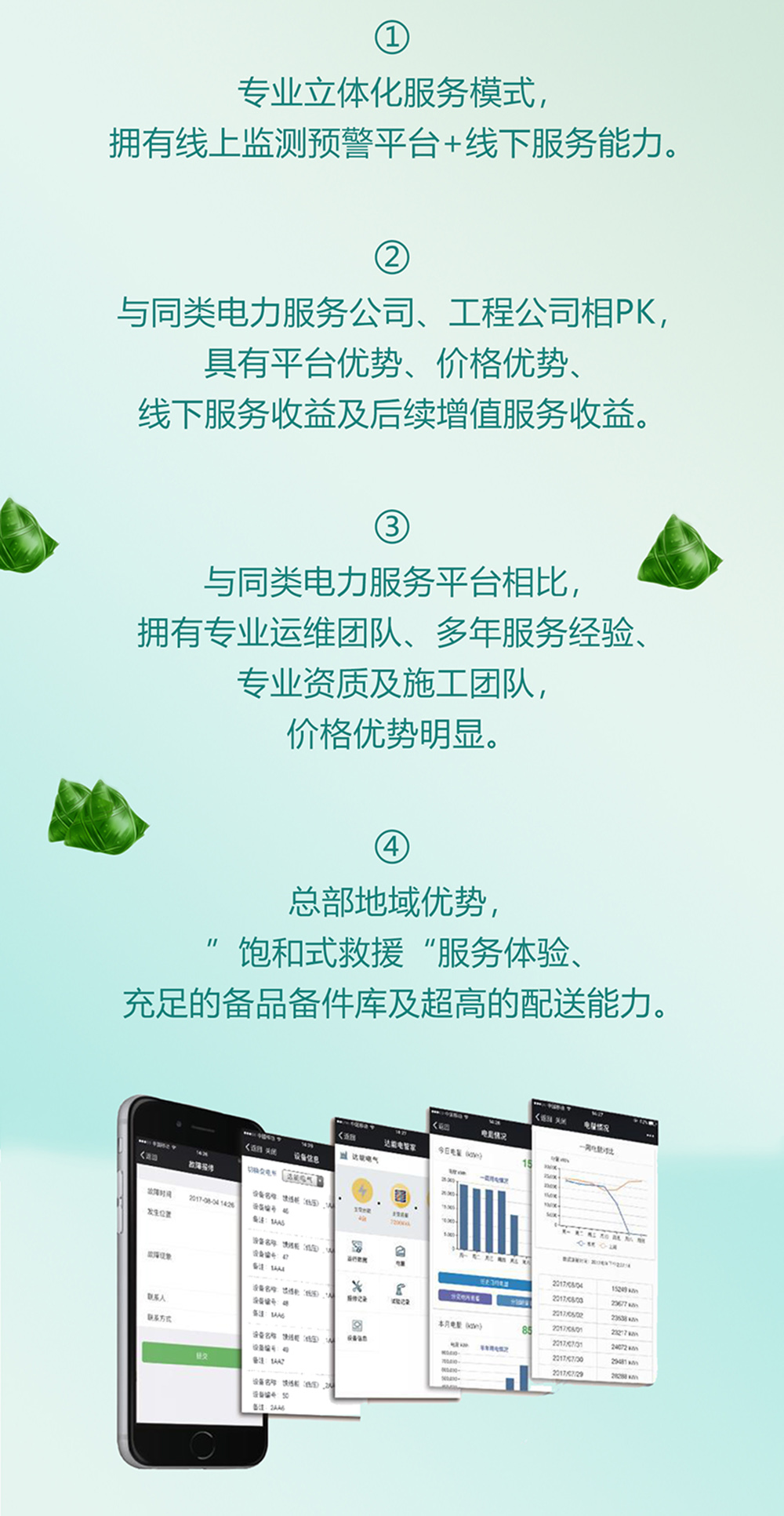 達(dá)能電管家利用物聯(lián)網(wǎng)、大數(shù)據(jù)、云平臺,結(jié)合專業(yè)電力運維團(tuán)隊,構(gòu)建一站式電力運維平臺,讓用戶在電力運行保障及維護(hù)過程中體驗專業(yè)高效、精準(zhǔn)規(guī)范、安全經(jīng)濟(jì)的服務(wù)。數(shù)字引領(lǐng),智慧運維,線上監(jiān)測預(yù)警+線下服務(wù)能力,提供一站式解決方案及與“粽”不同的電力運維服務(wù)!達(dá)能電管家—您身邊專業(yè)的電力服務(wù)專家。端午佳節(jié),達(dá)能電管家祝您端午安康!
