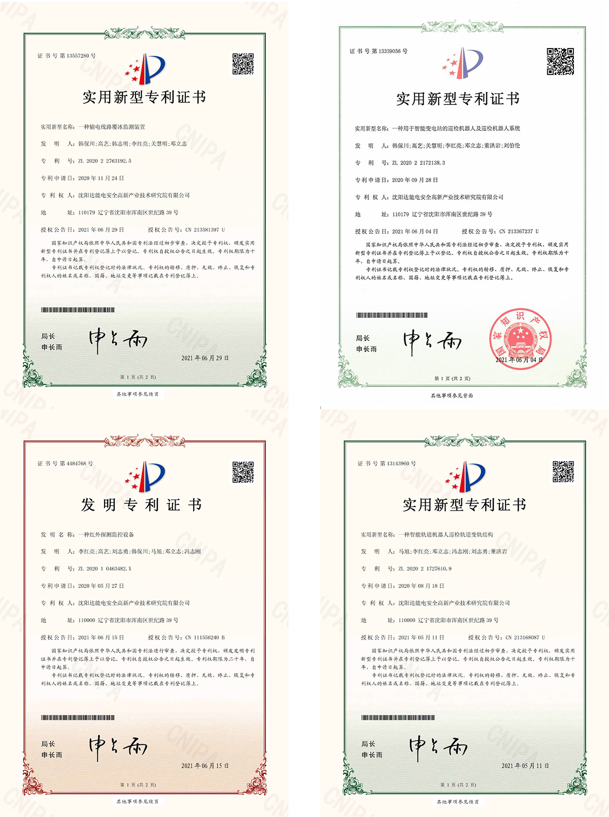 實用新型專利包括:《一種用于智能變電站的巡檢機(jī)器人及巡檢機(jī)器人系統(tǒng)》、《一種輸電線路覆冰監(jiān)測裝置》、《一種智能軌道機(jī)器人巡檢軌道變軌結(jié)構(gòu)》,發(fā)明專利為《一種紅外探測監(jiān)控設(shè)備》。