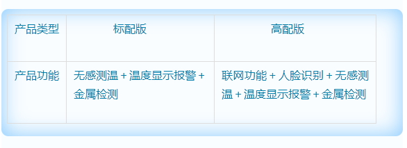此設備提供兩種選型,可根據(jù)預算和應用場景選擇不同設備選型,主要差別在于測溫距離的遠近,同時測溫人員的數(shù)量,熱成像分辨率,聯(lián)網(wǎng)人臉識別等。