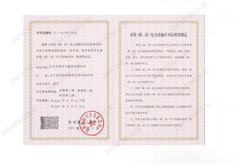 資質(zhì)是一個(gè)企業(yè)的硬實(shí)力,是企業(yè)專業(yè)精尖的有力說(shuō)明,是企業(yè)不斷前行的有力保障。達(dá)能電氣擁有承裝、承修、承試資質(zhì)證書(shū),為電力設(shè)施研發(fā)、設(shè)計(jì)、施工保駕護(hù)航。2020年底,達(dá)能電氣完成了承裝、承修、承試資質(zhì)三級(jí)升二級(jí),并取得資質(zhì)證書(shū)。此次資質(zhì)升級(jí),是達(dá)能人不斷開(kāi)拓,積極進(jìn)取的成果,也代表了達(dá)能電氣業(yè)務(wù)水平、解決方案能力的不斷提升。更激勵(lì)我們砥礪前行,勇攀高峰。