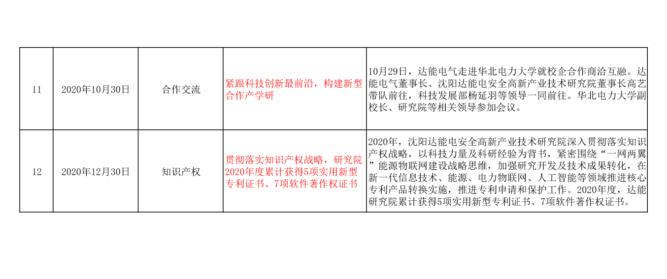 沈陽達能電安全高新產(chǎn)業(yè)技術(shù)研究院有限公司(以下簡稱研究院),作為達能電氣集團旗下專注于電力安全產(chǎn)業(yè)技術(shù)研究的研發(fā)機構(gòu),自成立以來,根據(jù)政府相關(guān)要求,在遼寧省、沈陽市科技局指導下,2020年度各項工作順利有效推進。2020年達能研究院立足電力安全前沿技術(shù),以科研實力及行業(yè)經(jīng)驗為背書,積極發(fā)揮研究院技術(shù)優(yōu)勢,廣泛吸納優(yōu)秀技術(shù)人員。2020年研究院圍繞產(chǎn)品研發(fā)、科研公關(guān)、科技成果轉(zhuǎn)化、知識產(chǎn)權(quán)戰(zhàn)略、技術(shù)交流、產(chǎn)學研互動等方面積極開展工作。