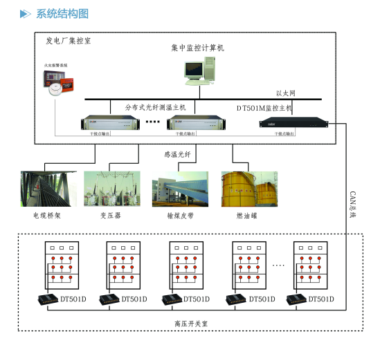 系統(tǒng)通過(guò)CAN總線(可選配為RS-485)連接多臺(tái)DT-501D,完成溫度、報(bào)警、故障等數(shù)據(jù)的采集處理;通過(guò)以太網(wǎng)接口送入計(jì)算機(jī)管理系統(tǒng),支持與變電站綜合管理系統(tǒng)、MIS、SCADA、DCS等管理系統(tǒng)相連接;DT-501M可通過(guò)繼電器端口與消防火災(zāi)報(bào)警系統(tǒng)相連,當(dāng)有火災(zāi)發(fā)生時(shí),發(fā)出聲光報(bào)警,并進(jìn)行滅火裝置聯(lián)動(dòng).
